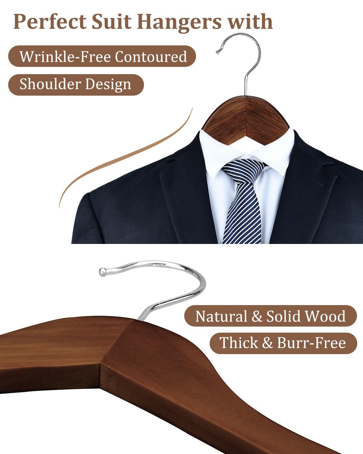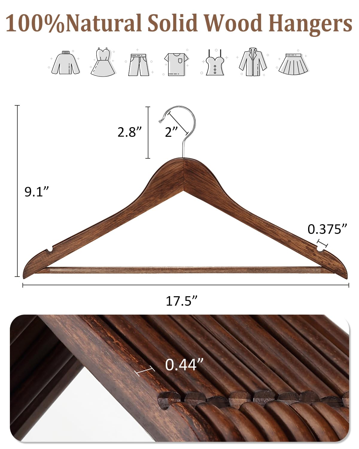 - Set Of 20 Premium Wooden Suit Hangers: AMKUFO walnut wooden hangers are 20pcs per pack. Hand-crafted from primary eucalyptus wood with a solid construction and strong holding capacity, these pant hangers are sturdier and durable. 17.5"L x 8.8"W is perfect size for adult suits, coats and other heavier clothes