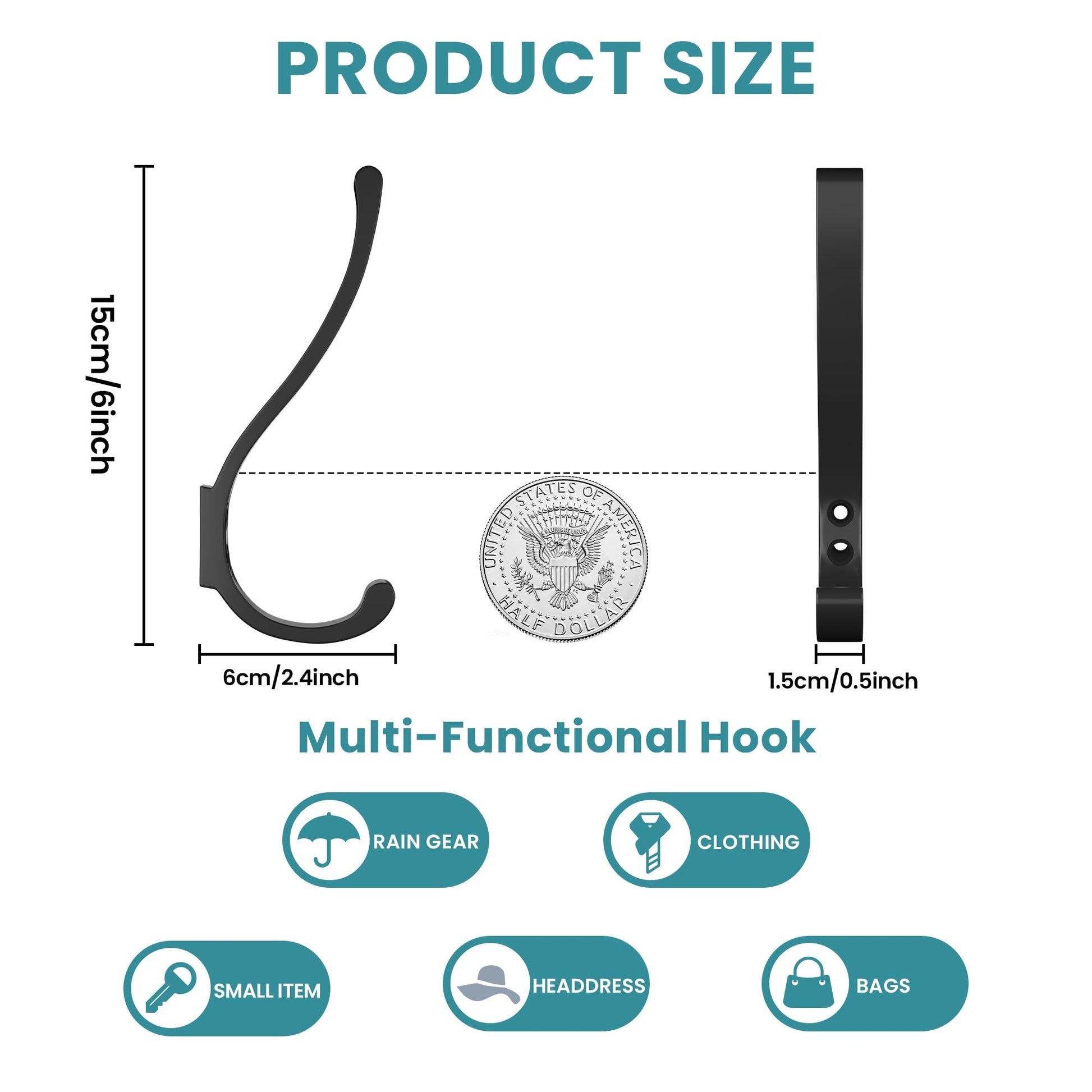 - 【Compact 6” Design Fits Tight Spaces】6” L x 2.4” W slim profile mounts flush to walls, behind doors, or in narrow hallways. Six rust-resistant hooks maximize vertical space without clutter.
