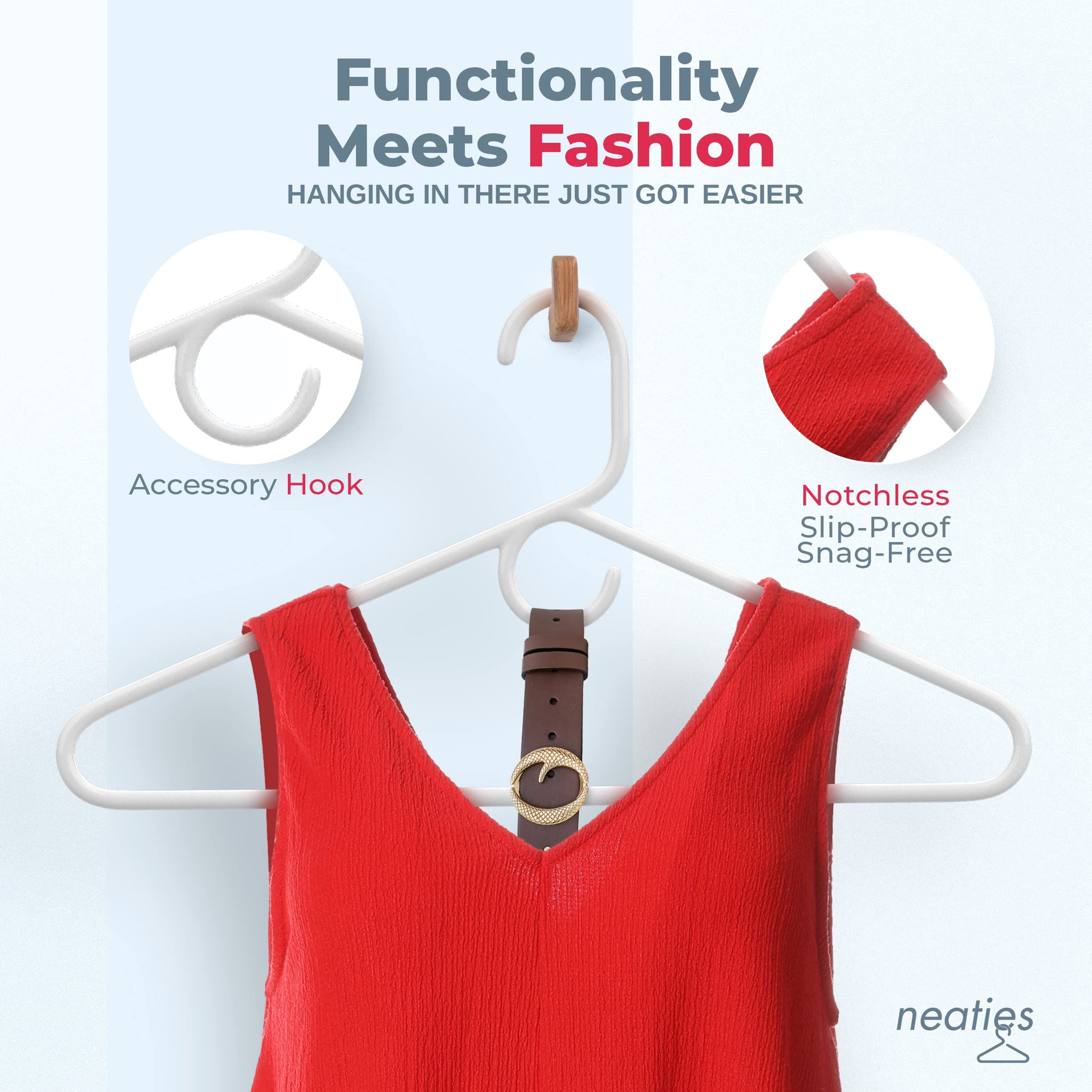 - HIGH-QUALITY SLIM DESIGN - These plastic coat hangers are made using high-quality and strong materials. The hangers plastic design also includes a convenient accessory hook, making them useful for ties, scarves, belts, and other accessories.