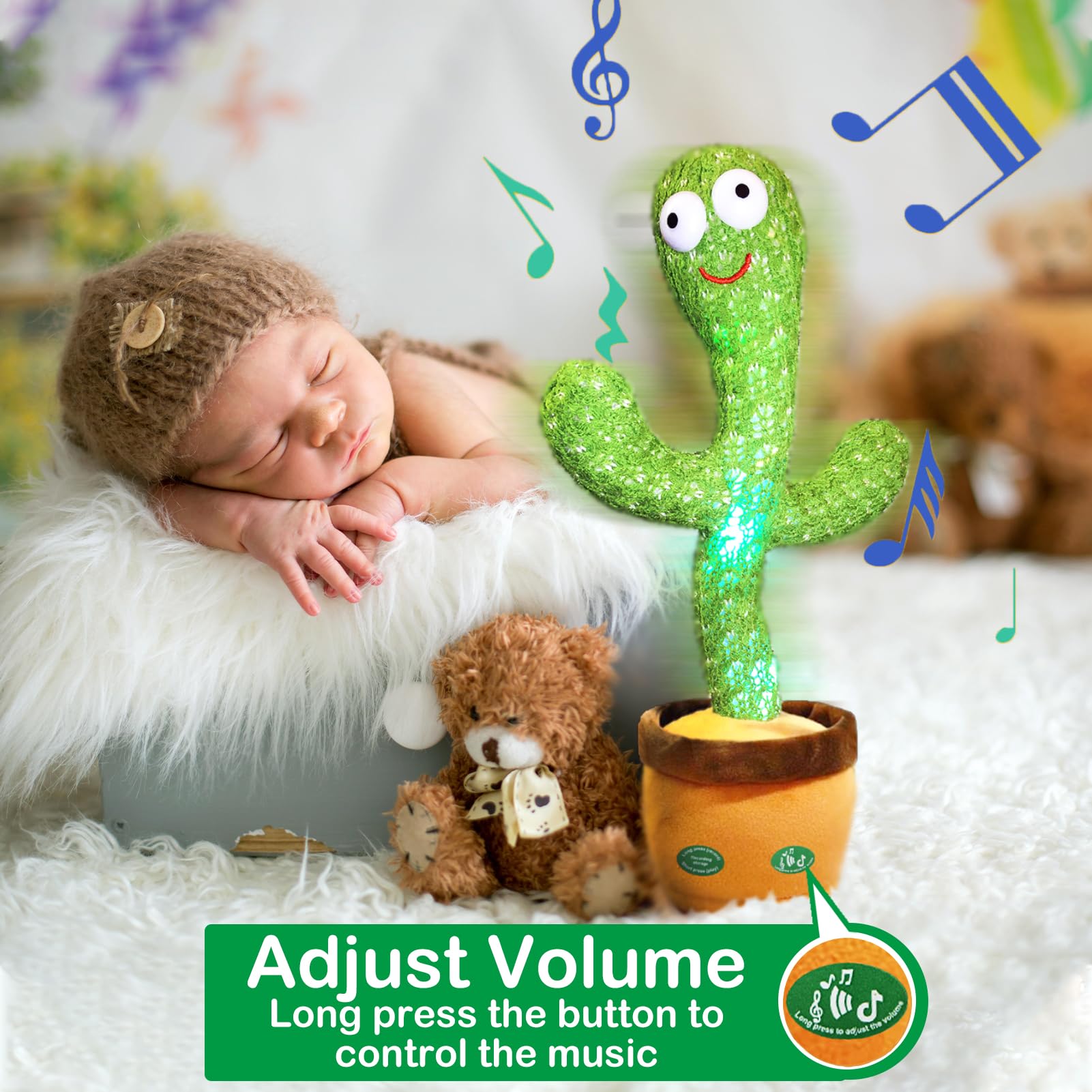 - [Safe Material] This toddler cactus toy is made of non-toxic and harmless plush fabric, soft and comfortable for kids to play with. The cactus mimicking toy meets international children's toy safety standards to ensure a safe experience while playing. You can clean it up by wiping off the dust with a damp cloth. If the volume and dancing become weak, please replace the battery in time. Please remove the battery if you don't play for a long time.