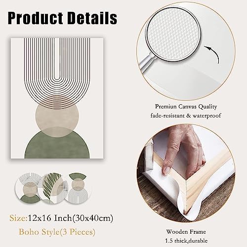 Sage Green Boho Wall Art Set of 3, Minimalist Framed Wall Art Geometric Line Leaf Sun Moon Beige Green Canvas Artwork Paintings, Abstract Botanical Boho Room Decor, Office, 12"x16"